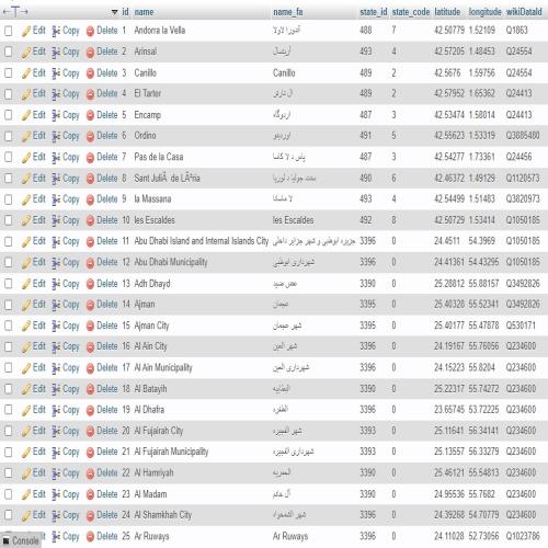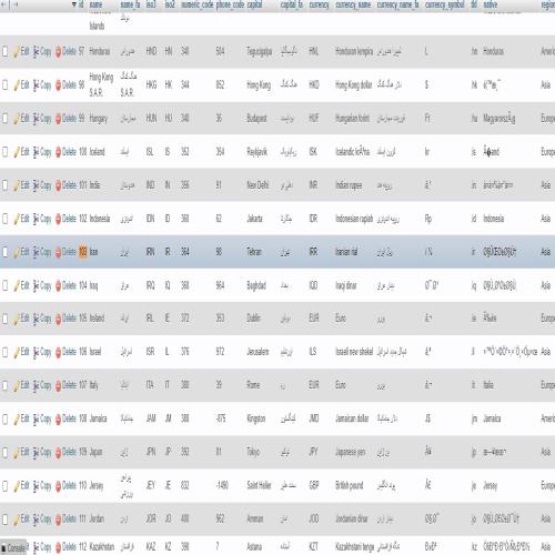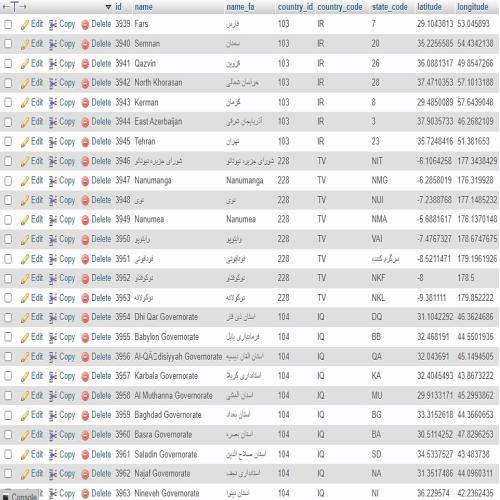 دانلود دیتابیس لیست تمامی کشور ها و شهر های دنیا بصورت فایل sql و قابل انتقال به اکسل یا اکسس دیتابیس شامل : 251 کشور ، 4.979 استان ، 148.354 شهر می باشد که اسم شهر ها ، استان ها ، کشور ها به صورت یک فیلد جداگانه به فارسی نیز موجود می باشد . در جدول کشور ها علاوه بر اسم کشور ها نام کوتاه شده آن ها و همچنین پایتخت ، واحد پول ، نام واحد پول ، قاره و همچنین طول و عرض جغرافیایی نیز موجود می باشد . طول و عرض جغرافیایی برای همه کشور ها ، استان ها و شهرها نیز به صورت فیلد جدذاگانه اضافه شده است . نکته : هر سه جدول با استفاده از id به یکدیگر متصل می شوند و میتواانید ریلیشن های خود را بر پایه آن ها بسازید .