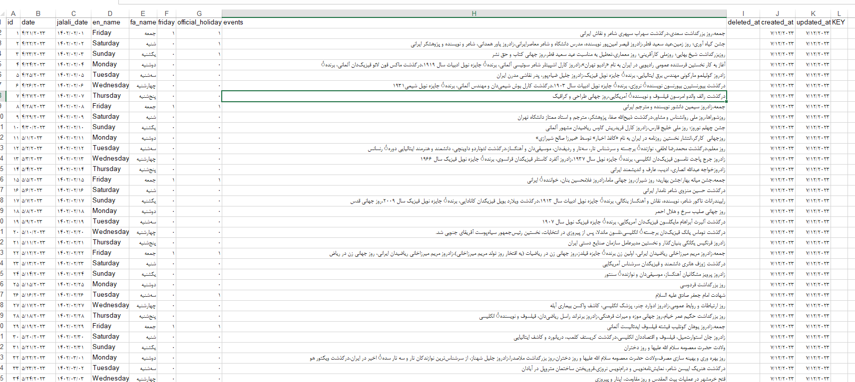 در این دیتابیس فیلد های تاریخ شمسی فارسی ، تاریخ میلادی ، تغعطیلات جمعه ، تعطیلات رسمی سال و رویداد ها (شهادت ولادت و ….) به طور کامل لحاظ گردد