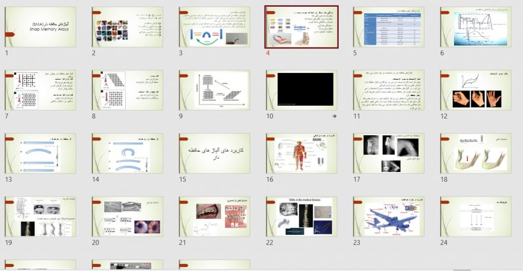 پاورپرونت ارائه آلیاژ های حافظه دار Shap Memory Alloys تحقیق آماده برای دانشجویان مکانیک و سایر رشته های مرتبط این محصول جدای از فایل پاورپوینت یک فایل ورد هم کنار خودش داره که توضیحات مربوط به هر اسلاید که با مطالعه فایل ورد راحت میتونید ارائه بدید این فایل ارئه شامل عکس ها و ویدیوی نمونه های استفاده آلیاژهای حافظه دار + فایل ورد راهنما ارائه نمایی از پاورپروینت